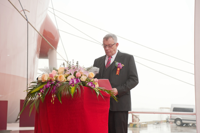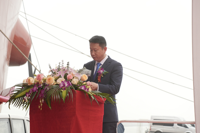 教母中信銀行蘇州分行副行長(zhǎng)倪衛(wèi)芳女士,HARTMANN董事會(huì)執(zhí)行總監(jiān)Ulrich Adami先生、董事會(huì)商務(wù)總監(jiān)Jan-Lars Kruse先生、新造船經(jīng)理Ionut Cornea先生、大中華區(qū)區(qū)域經(jīng)理龍葉飛先生,DNV船級(jí)社江陰站經(jīng)理史勇林先生,中信銀行太倉(cāng)分行行長(zhǎng)顧衛(wèi)先生,三井物產(chǎn)上海井上伸一先生、住田直也先生、田野先生,揚(yáng)子江船業(yè)集團(tuán)副總經(jīng)理丁建文先生,集團(tuán)副總經(jīng)理兼揚(yáng)子三井總經(jīng)理宋書明先生,揚(yáng)子三井CFO石丸雄次先生、COO田村光路先生、副總經(jīng)理陳國(guó)強(qiáng)先生及總經(jīng)理助理中尾慎一先生以及各合作方、員工等代表參加了命名交船儀式。