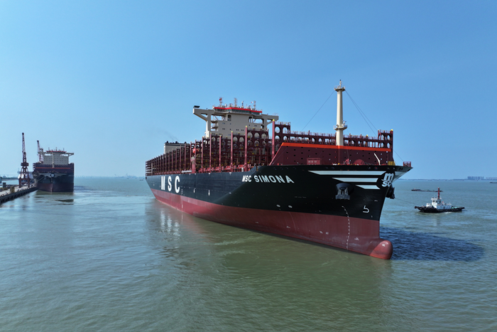 8月31日下午,我集團(tuán)揚(yáng)子鑫福造船為SEASPAN、MSC船東建造的第九艘16000TEU集裝箱船——“MSC SIMONA”輪交付離廠,上線MSC船隊運(yùn)營。