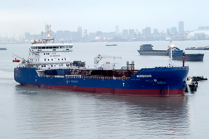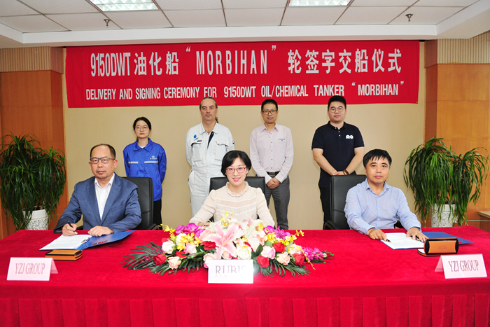 On October 14th, the first 9150DWT oil tanker "MORBIHAN" built by NYZ of our group was successfully delivered to French shipowner RUBIS. Ms. Sun Chuanling, the lawyer of Shipowner RUBIS, Mr. Du Chengzhong, Deputy General Manager of our Group and Mr. Zhang Tao, Deputy General Manager of our Group signed the delivery documents on behalf of each party respectively.