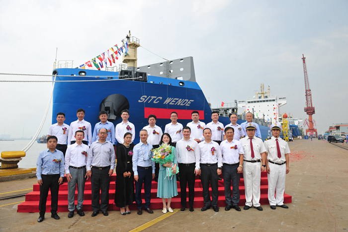 Ma Jiwei named thenew ship “SITC XINGDE”, and Yang Shurui cut the cable and threw champagne. Li Ruimin named the new ship "SITC WENDE", and Yin Chunyan cut the cableand threw champagne, praying the new ship smooth sailing and full load trip.